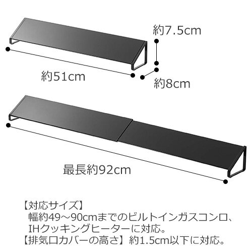 仕様 サイズ:約W51〜92×D8×H7.5cm 素材:スチール(粉体塗装) 対応サイズ:幅約49〜90cmまでのビルトインガスコンロ、IHクッキングヒーターに対応。